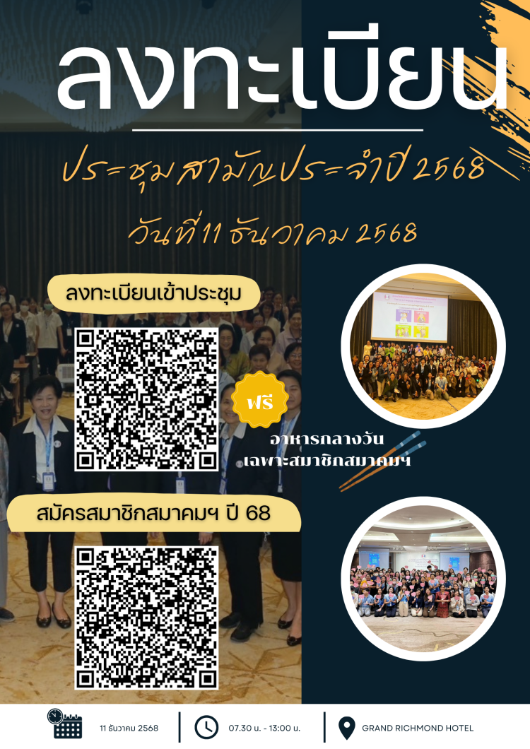 ดาวน์โหลดเอกสารเชิญประชุมวิชาการ ได้ที่ > เอกสารเชิญประชุมวิชาการและประชุมใหญ่สามัญประจำปี 2568